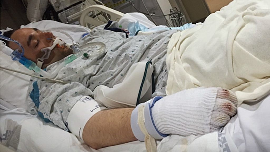 Justin passou cerca de três meses internado - seus rins e pulmões não funcionavam, e ele teve os dedões do pé e os dedos mínimos das mãos amputados por decorrência de gangrena.